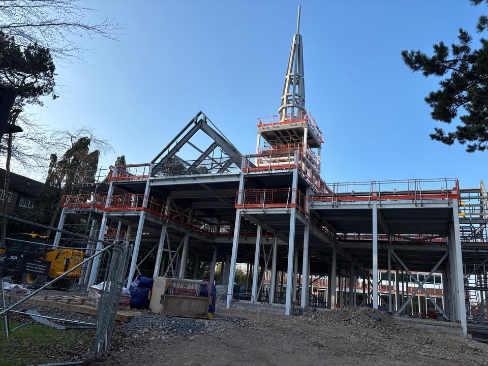 It has been just over a year since the groundbreaking ceremony was held for the Birmingham England Temple, and construction continues to move forward steadily. The structural frame for the temple is now in place, marking a significant milestone as work transitions to framing the exterior walls and interior spaces with light-gauge steel. Behind the temple, construction is also underway on an ancillary building that will provide arrival facilities and patron accommodations.