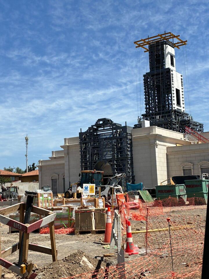 Steady progress is being made on the exterior cladding of the Santiago West Chile Temple, as crews carefully install the stone panels that will define the building’s finished appearance. A prominent feature of the design is the temple’s inviting portico, distinguished by a graceful arched opening and ornate mission-style detailing that reflects both tradition and regional character. Attention to quality craftsmanship is clearly evident.