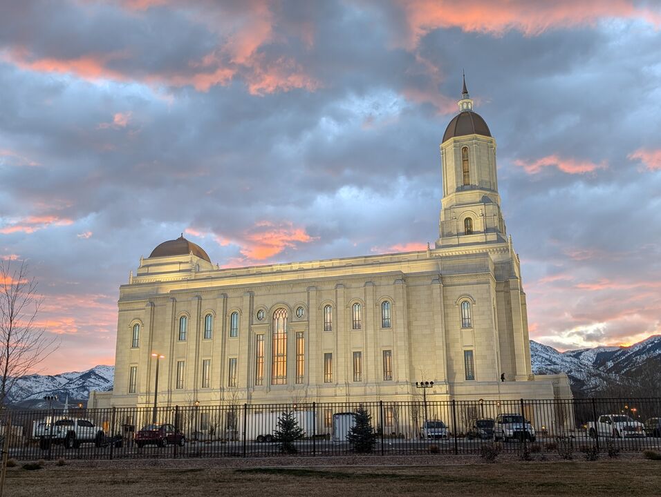 The day dawn was breaking last Monday at the Smithfield Utah Temple site where the magnificent house of the Lord was captured under a dramatic sky of soft, layered clouds with pink highlights. Architectural lighting accentuated the upper walls and towers of the beautiful stone-clad temple. Once completed and dedicated, the temple will serve Church members on the north end of Cache Valley. No dates have been announced yet for the open house and dedication.