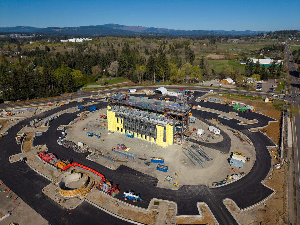 Exterior enclosure work has begun on the Vancouver Washington Temple, located in the community of Camas, as crews install yellow sheathing panels across the structure. Framing materials are staged throughout the site, supporting continued work on the exterior wall systems. On the grounds, asphalt paving covers much of the looping drive and parking areas, with curbing clearly defined. On the west side of the temple, formwork is in place for a large circular plaza.