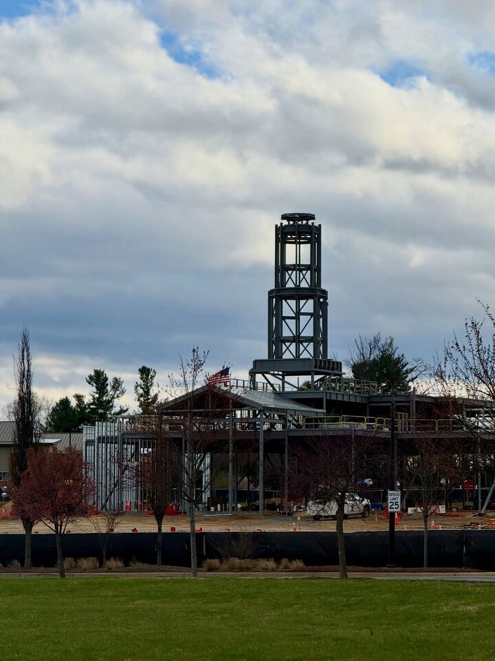 Evenly spaced steel studs are being secured to the structural steel beams of the Winchester Virginia Temple to frame the exterior walls. Above, framing for the upper tier of the steeple has been installed, and the steel base for the spire is now in place. A United States flag flies atop the portico roof at the main entrance. Construction has been underway for approximately eight-and-a-half months.