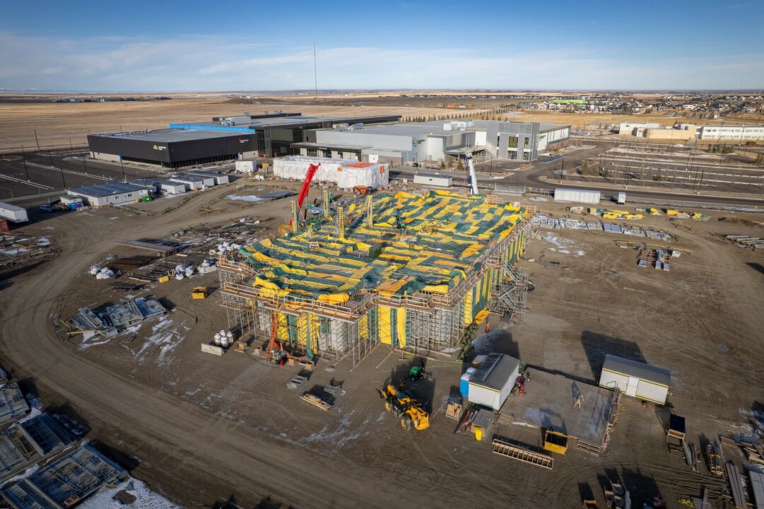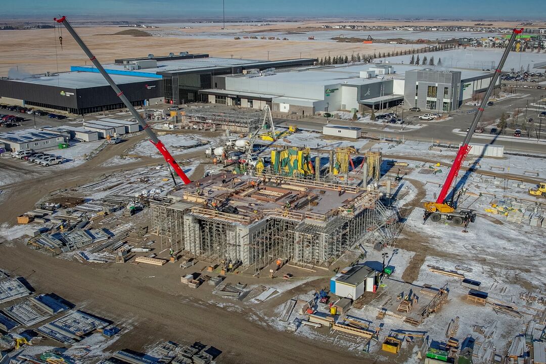 With the structural walls in place for the ground floor of the Lethbridge Alberta Temple, the floor slab for the second story has been poured, and the concrete is curing under yellow-and-green-striped tarps. Concrete forms and reinforcing steel bar are staged on site, ready to be used for building the second-story exterior walls. The temple is rising across the street from a massive sports facility that houses an aquatics centre, fitness centre, two ice arenas, and a curling club.