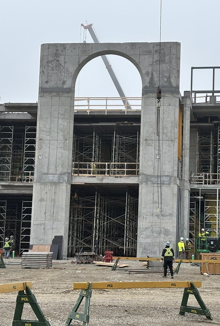 On the back side of the Lethbridge Alberta Temple, a concrete arch has been installed where the windows and decorative headers for the baptistry and celestial room will be located. On top of the building, concrete slabs are being poured for the floor of the mechanical level and the roofs of the east and west wings. Inside, shoring towers have been erected to support the curing concrete.