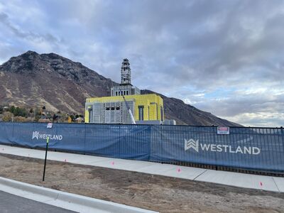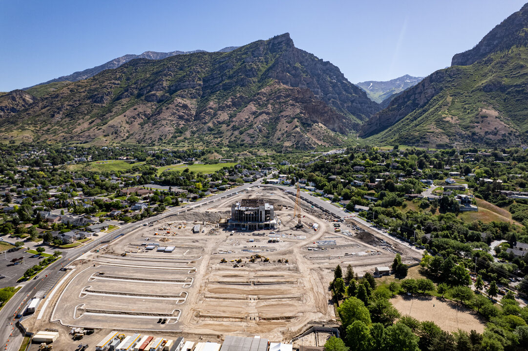 A recent photograph of the Provo Utah Rock Canyon Temple showcases the iconic craggy mountains that form the entrance to Rock Canyon, east of the temple. At the northwest corner of the temple property, parking lot curbing has been installed, and work has begun on the section to the south. The first columns for the steeple frame have been secured to the top of the temple while light-gauge framing is progressing on the exterior.
