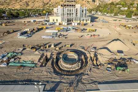 Recent aerial photographs of the Provo Utah Rock Canyon Temple give a sense of the large footprint being constructed for the building. Concrete footings are being formed and poured, and three elevator shafts are rising on the west end. Two rooms and a hallway have been created below the level of the footings for housing and accessing the baptismal fonts.