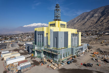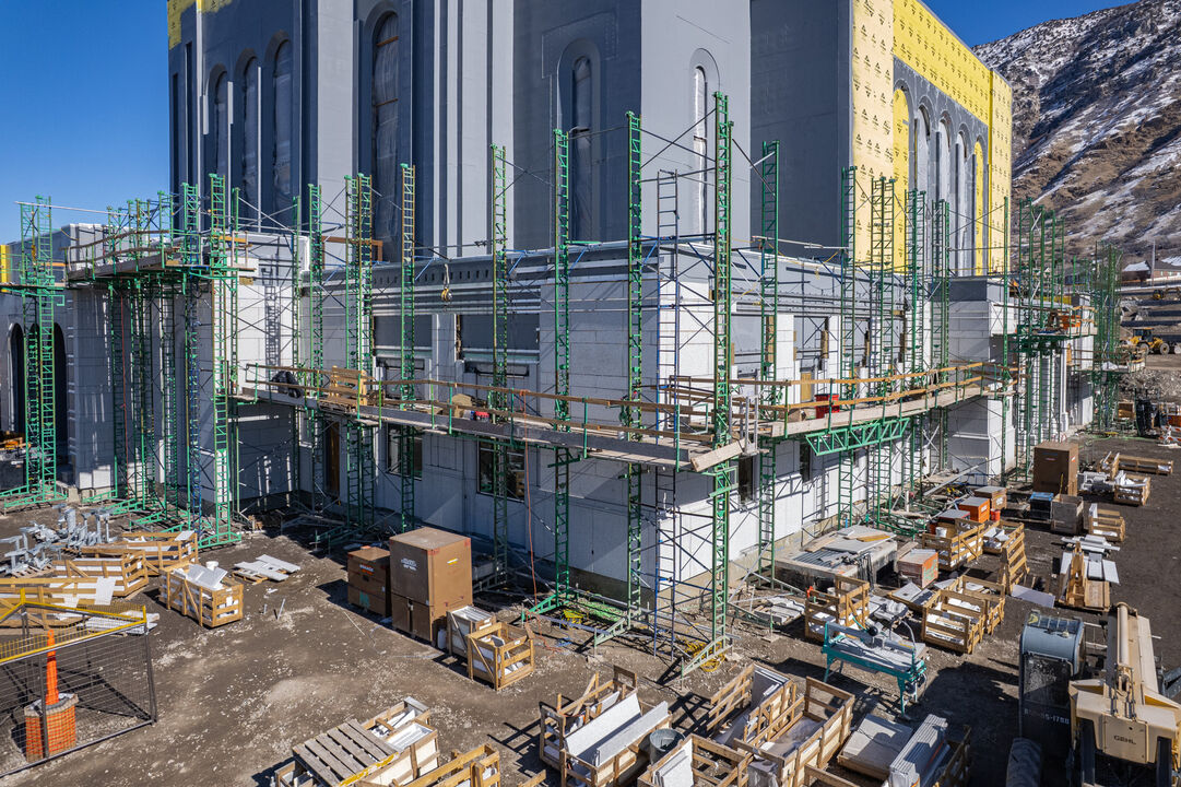 The iconic snow-capped peaks of Mount Timpanogos form a dramatic natural backdrop for the Provo Utah Rock Canyon Temple where exterior cladding is progressing. Work has begun along the base of the south side of the temple, while stonework progresses up the southwest wall of the front facade. Waterproofing of the sheathing continues, and more hardscape elements are being added on the grounds.