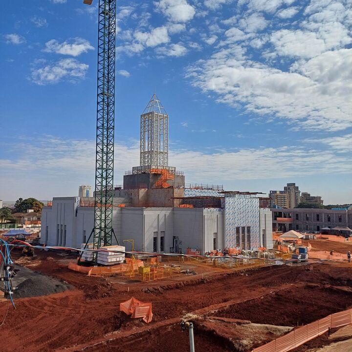 Shear walls are being installed for the Ribeirão Preto Brazil Temple, as heavy steel framing continues for the load-bearing interior walls. Church members in the city are organized into three stakes—the Ribeirão Preto Brazil East Stake, the Ribeirão Preto Brazil West Stake, and the Ribeirão Preto Brazil South Stake. The temple will also be the closest house of the Lord for several other stakes in the surrounding region.