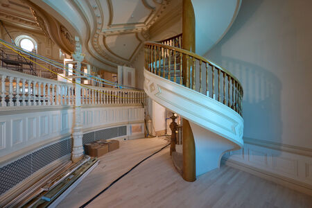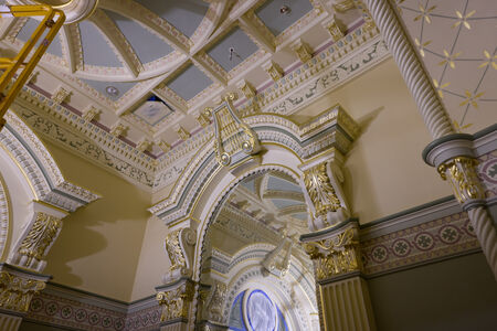 Finish work is well underway on the assembly room inside the Salt Lake Temple. The four spiral staircases have been refurbished, parquet flooring and wainscoting have been installed, and the ceiling details have been completed. The bride's suite has new light fixtures and painted ceiling medallions that reflect the original appearance of the room. The celestial room has been carefully restored, and the sealing rooms feature historically inspired color selections: green in the large rooms, blue in the medium rooms, and yellow in the small rooms.