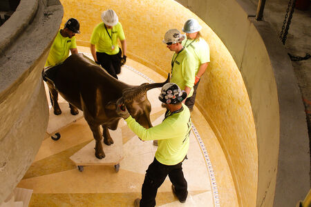 Inside the north addition to the Salt Lake Temple, oxen representing the Twelve Tribes of Israel have been placed under the two baptismal fonts. The original cast-iron oxen, each weighing 2,200 pounds, have been positioned under the east font, while new fiberglass oxen have been placed under the west font. Finish work is progressing in the sealing rooms and celestial room, and the woodwork for circular staircases in the corner towers is being restored. Extensive landscaping is moving forward, especially on the south side of Temple Square.