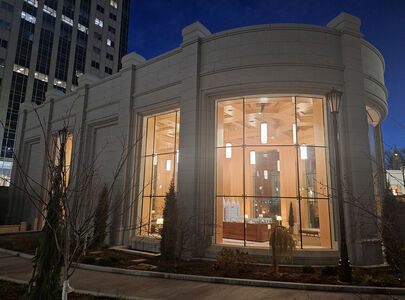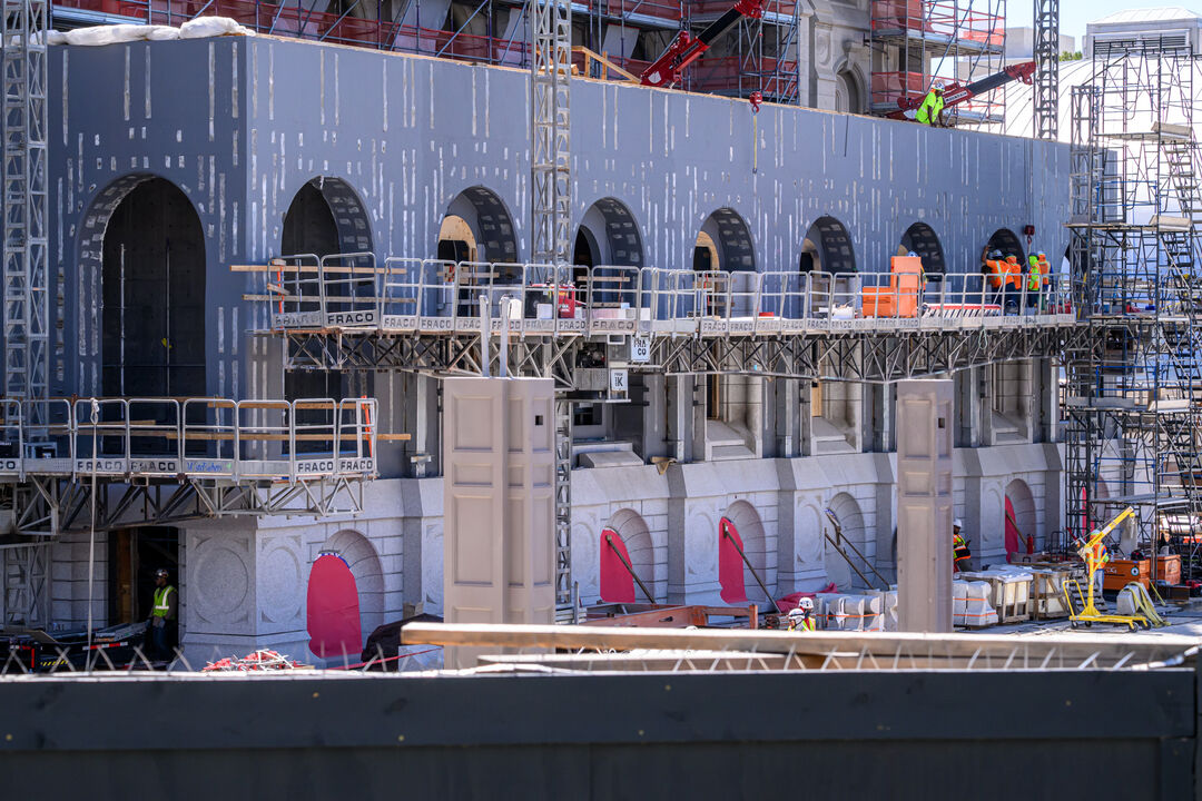 Finish work is progressing on the sealing rooms located in the sealing wing of the Salt Lake Temple. The rooms were recently fitted with new chandeliers, while in the temple's top floor assembly room, the original chandeliers were restored and rehung. There will be 22 sealing rooms in all with 12 located in the north underground addition and 10 in the historic temple and sealing wing. Stone cladding of the entrance pavilions is nearly completed, and millwork is getting underway inside. A six-month open house celebration is scheduled to take place from April to October 2027.