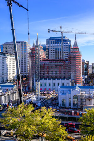 On the north side of Temple Square, the tower crane that has been used for more than four years to carry out major renovations of the historic Salt Lake Temple is being dismantled. Stone cladding of the new entrance pavilions and rebuilt sealing wing is almost finished, and work is underway on the skylight that will sit over the underground recommend desk. Sections of plastic sheeting have been removed from the Lion House to reveal the newly stuccoed exterior walls, while a small addition to the north end is under construction.